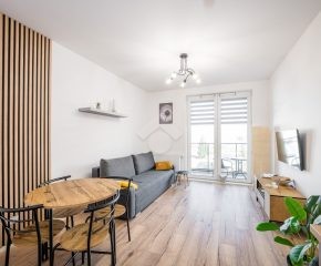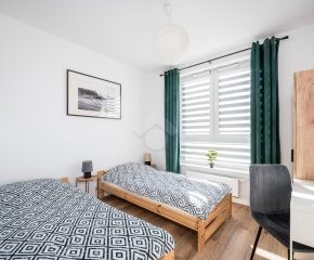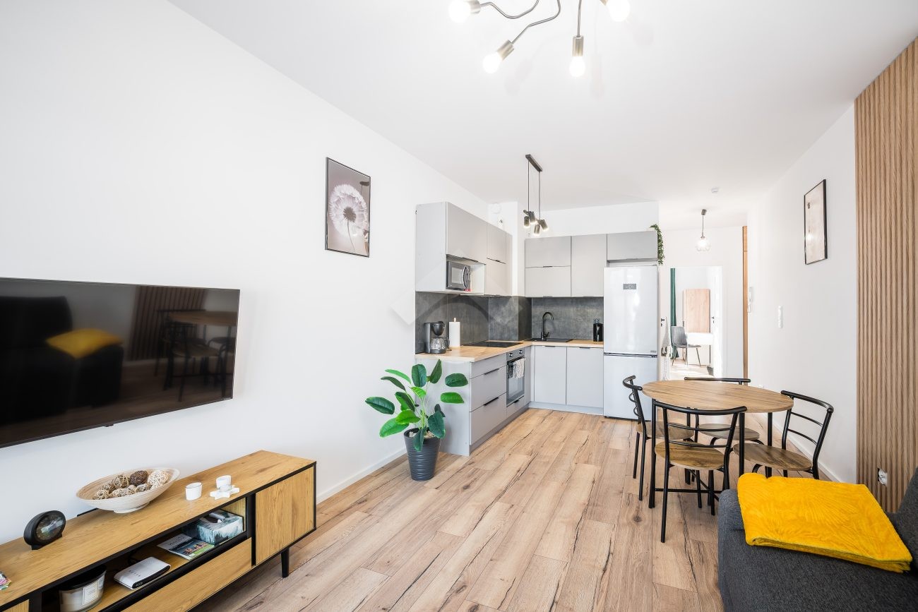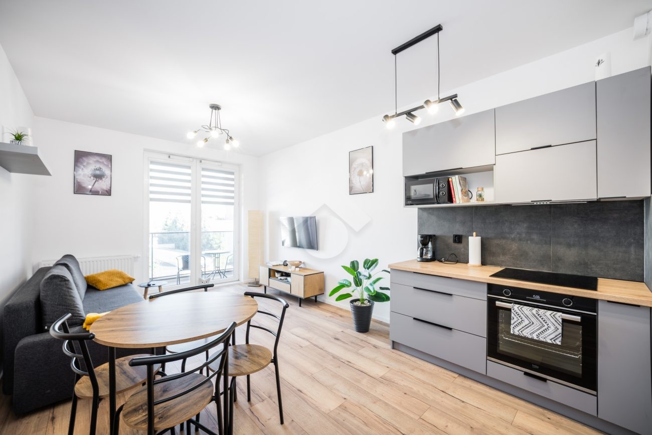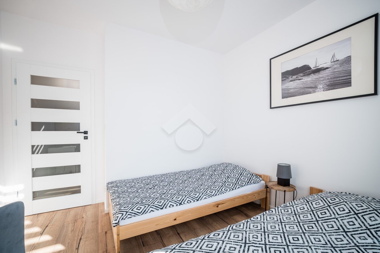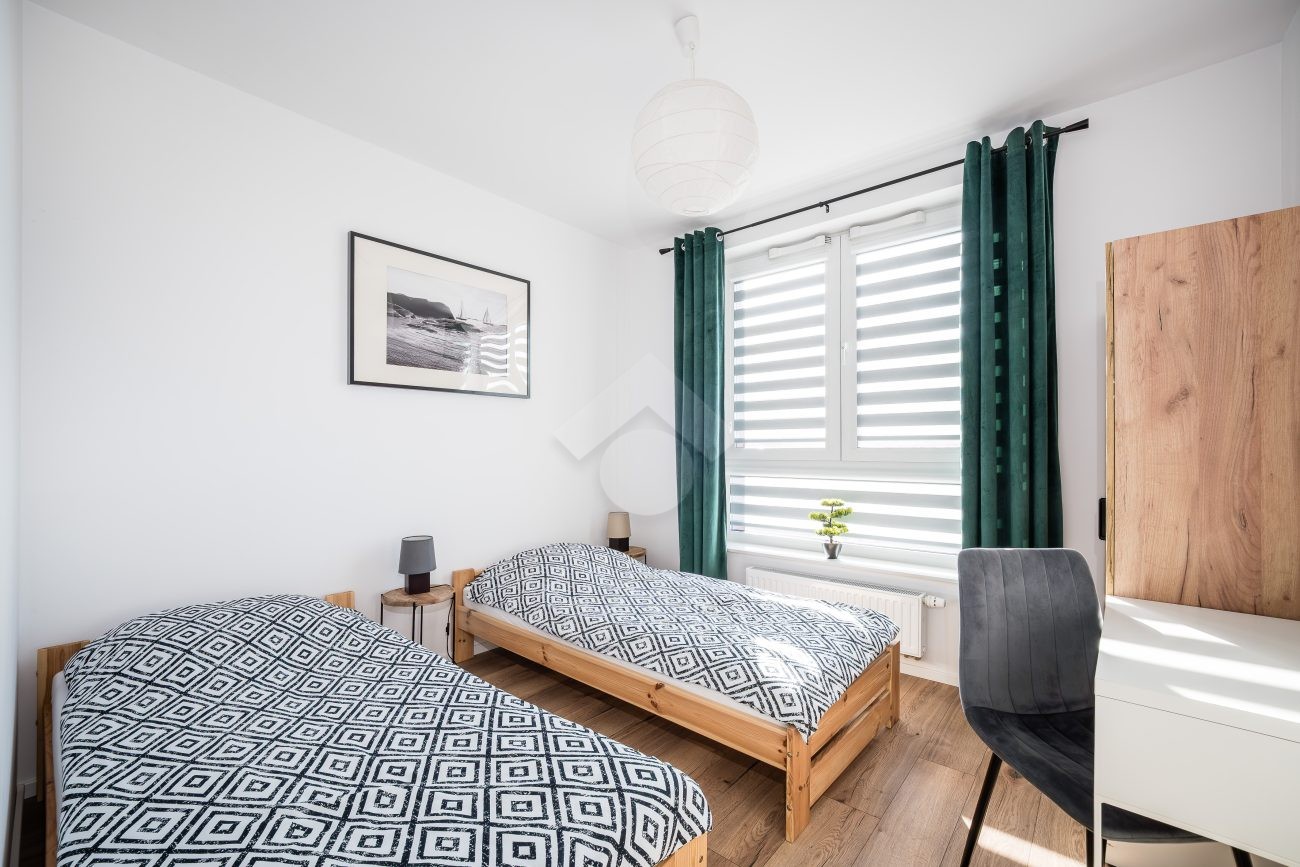 Salon z aneksem kuchennym wyposażony jest w zabudowę kuchenną wraz ze sprzętem AGD: piekarnik, płyta indukcyjna, okap, zmywarka, mikrofalówka oraz lodówka z zamrażarką. W części wypoczynkowej znajduje się rozkładana sofa, stół z krzesłami, szafka RTV oraz telewizor. Sypialnia została wyposażona w dwa pojedyncze łóżka, szafę oraz biurko. W przedpokoju znajduje się pojemna szafa w zabudowie, zapewniająca dużo miejsca do przechowywania.