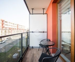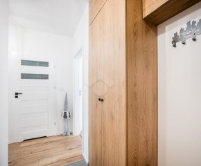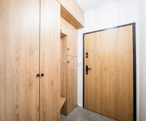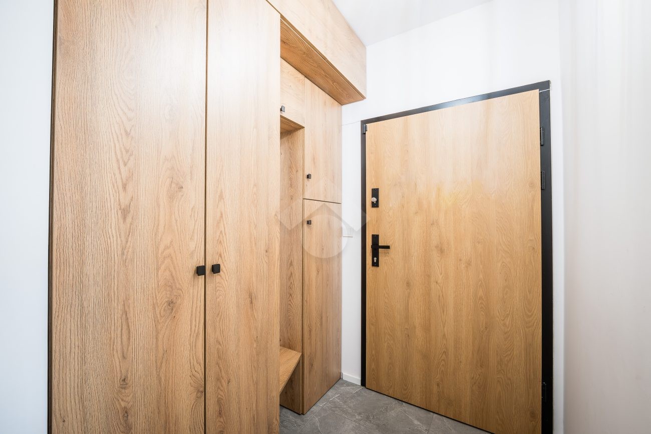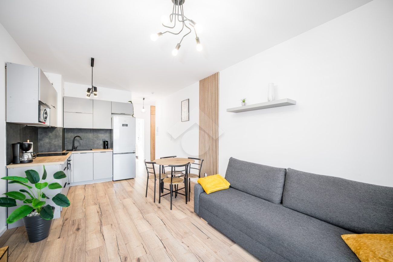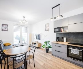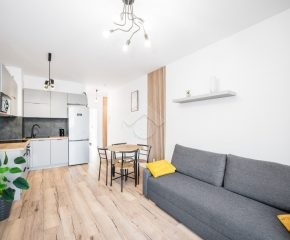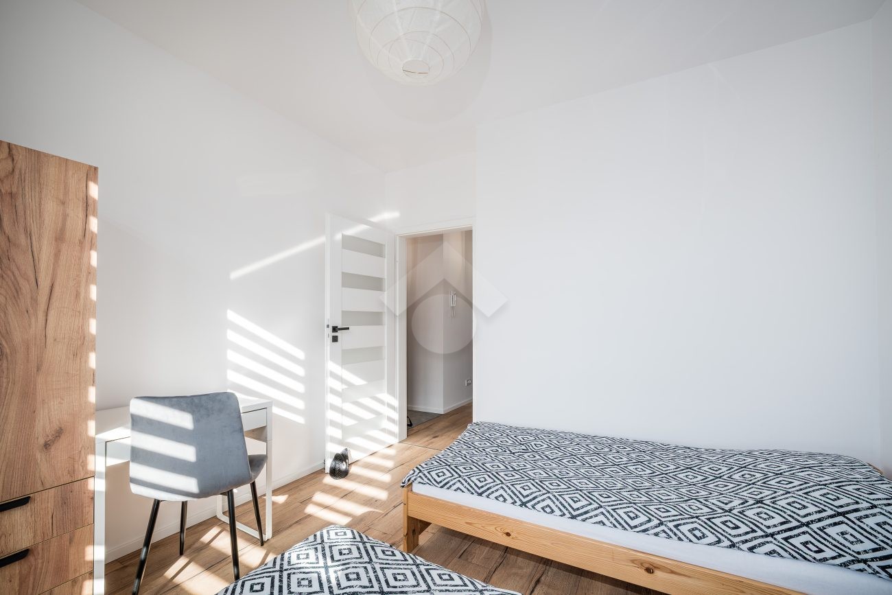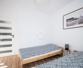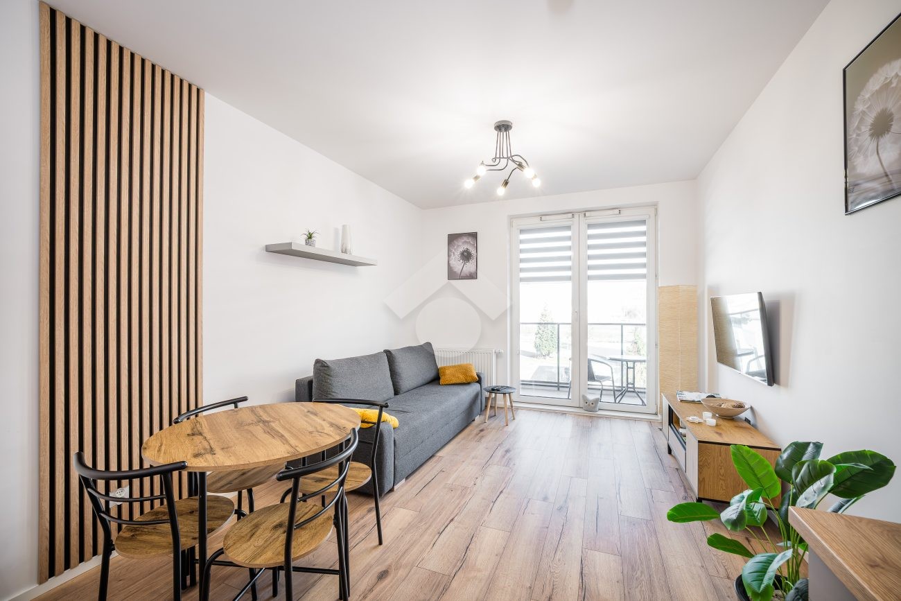 Salon z aneksem kuchennym wyposażony jest w zabudowę kuchenną wraz ze sprzętem AGD: piekarnik, płyta indukcyjna, okap, zmywarka, mikrofalówka oraz lodówka z zamrażarką. W części wypoczynkowej znajduje się rozkładana sofa, stół z krzesłami, szafka RTV oraz telewizor. Sypialnia została wyposażona w dwa pojedyncze łóżka, szafę oraz biurko. W przedpokoju znajduje się pojemna szafa w zabudowie, zapewniająca dużo miejsca do przechowywania.