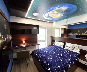W sypialni do dyspozycji najemcy jest duże, podwójne łóżko, biurko, telewizor, pojemna szafa oraz stoliki nocne.