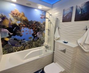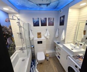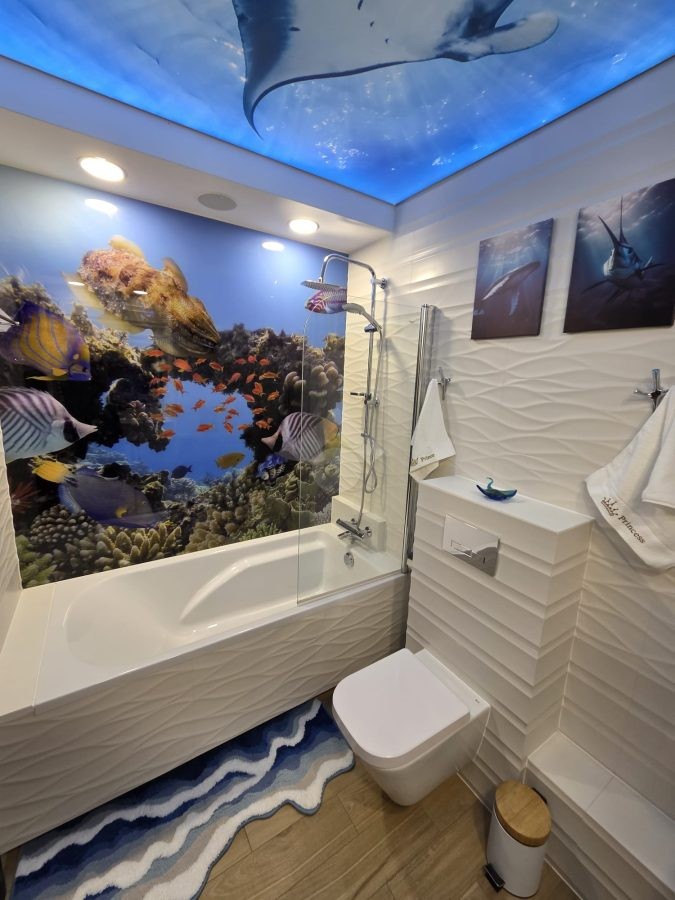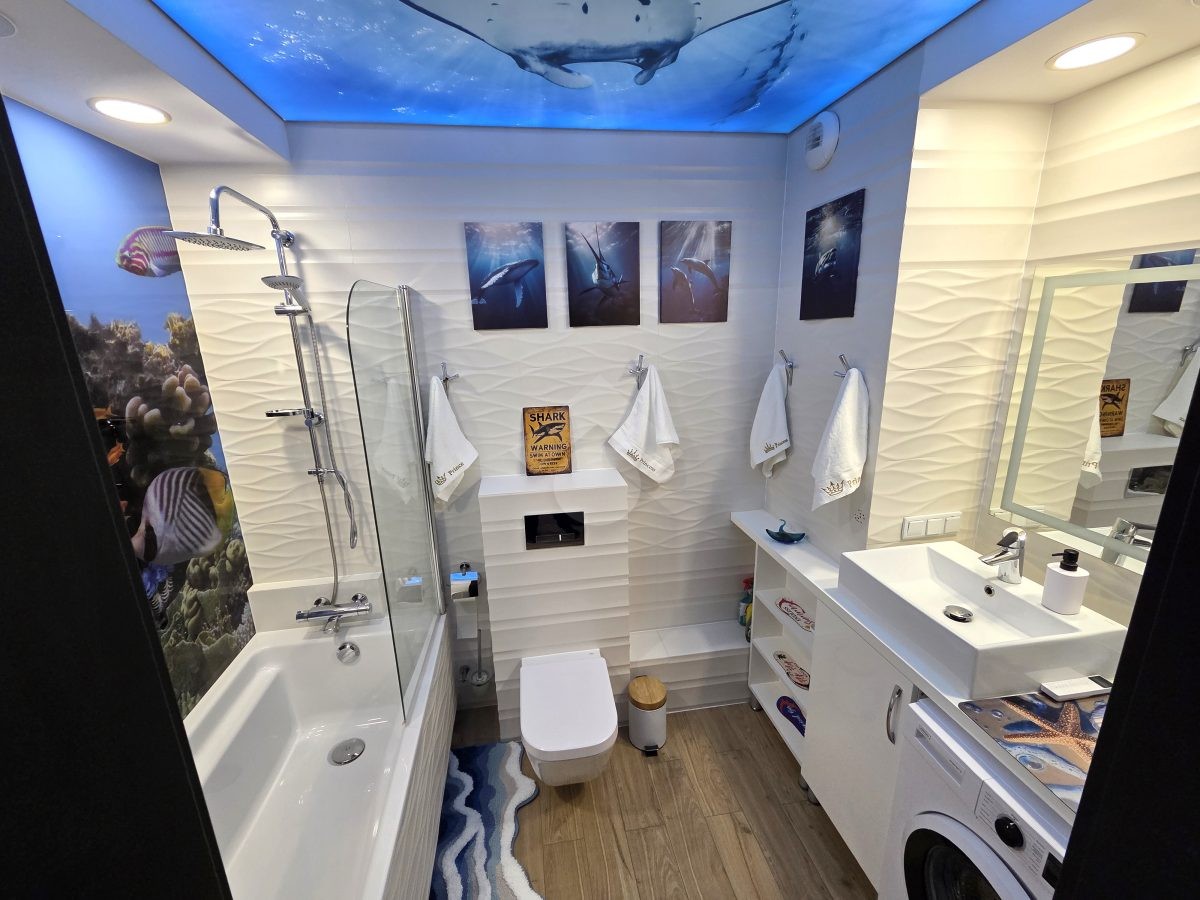 W łazience znajduje się wanna z funkcją prysznica i deszczownicą, pralka, umywalka oraz toaleta. Dodatkowym udogodnieniem jest zamontowany zestaw stereo.