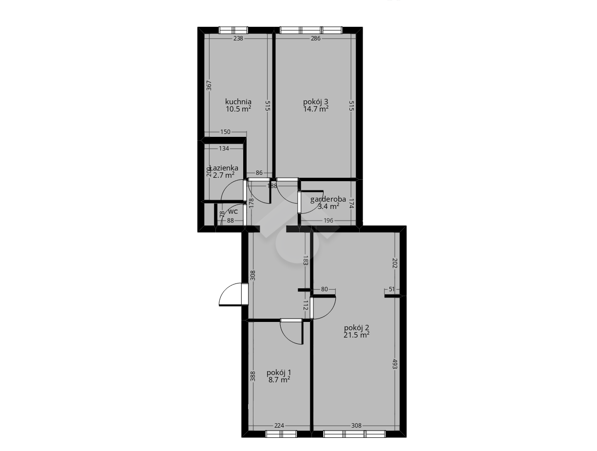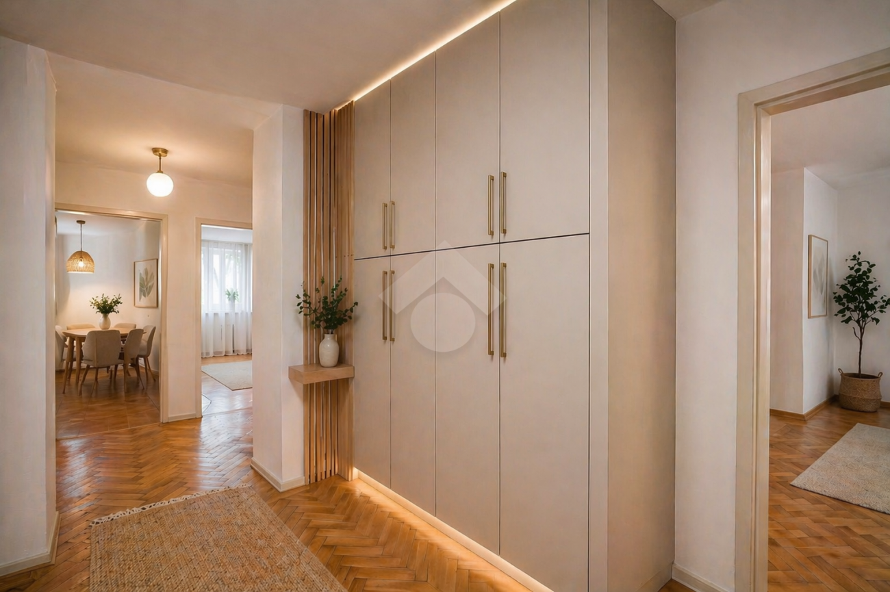Obecny układ obejmuje przestronny przedpokój z wnęką na duże szafy w zabudowie, 3 niezależne pokoje, garderobę/biuro, jasną kuchnię, łazienkę z prysznicem oraz osobne WC. Nieruchomość posiada ogromny potencjał: istnieje możliwość zmiany układu poprzez połączenie kuchni z sąsiadującym pokojem i uzyskania imponującego salonu z aneksem kuchennym oraz scalenia łazienki z WC.