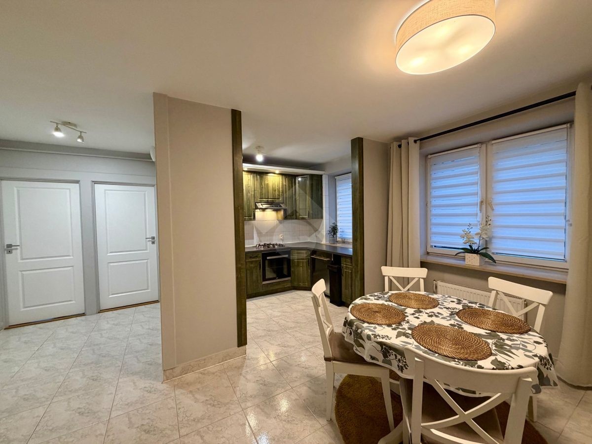 Nieruchomość w stanie bardzo dobrym. Składa się z przestronnego pokoju z otwartą kuchnią oraz jadalnią, dwóch sypialni, przedpokoju i łazienki z WC. Kuchnia została wyposażona w wysokiej jakości sprzęty użytku codziennego. W łazience znajduje się wanna, umywalka, pralka oraz WC. Ogrzewanie i ciepła woda z dwufunkcyjnego pieca gazowego.