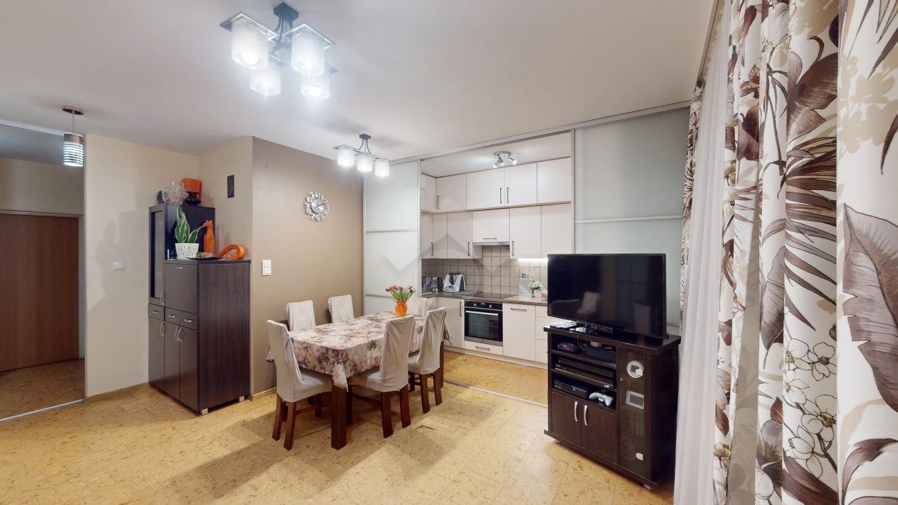 Przestronny salon z aneksem kuchennym zachwyca ciepłymi korkowymi podłogami, wygodną sofą oraz dużymi oknami, które wpuszczają mnóstwo naturalnego światła. Z salonu można wyjść na balkon, który świetnie sprawdzi się jako miejsce na chwilę wytchnienia.