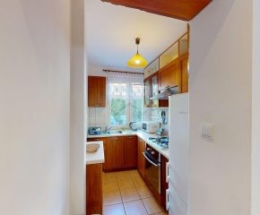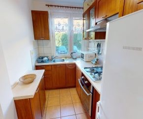 W kuchni znajdują się: gazowa płyta grzewcza, piekarnik, zlew oraz lodówka.