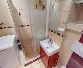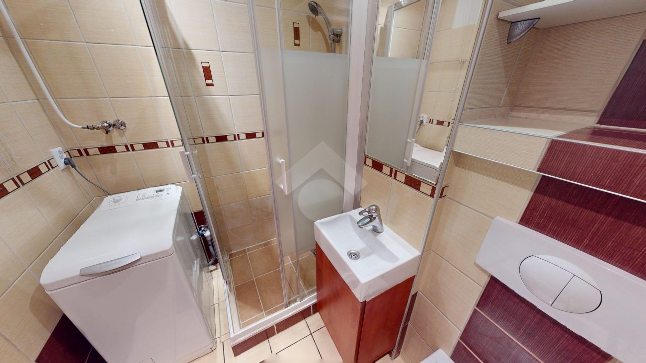 Łazienka wyposażona jest w prysznic, pralkę oraz umywalkę.