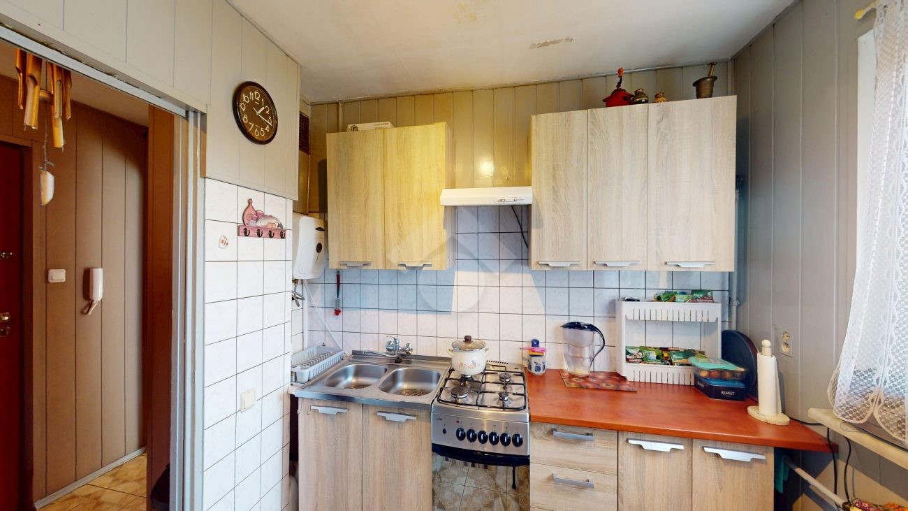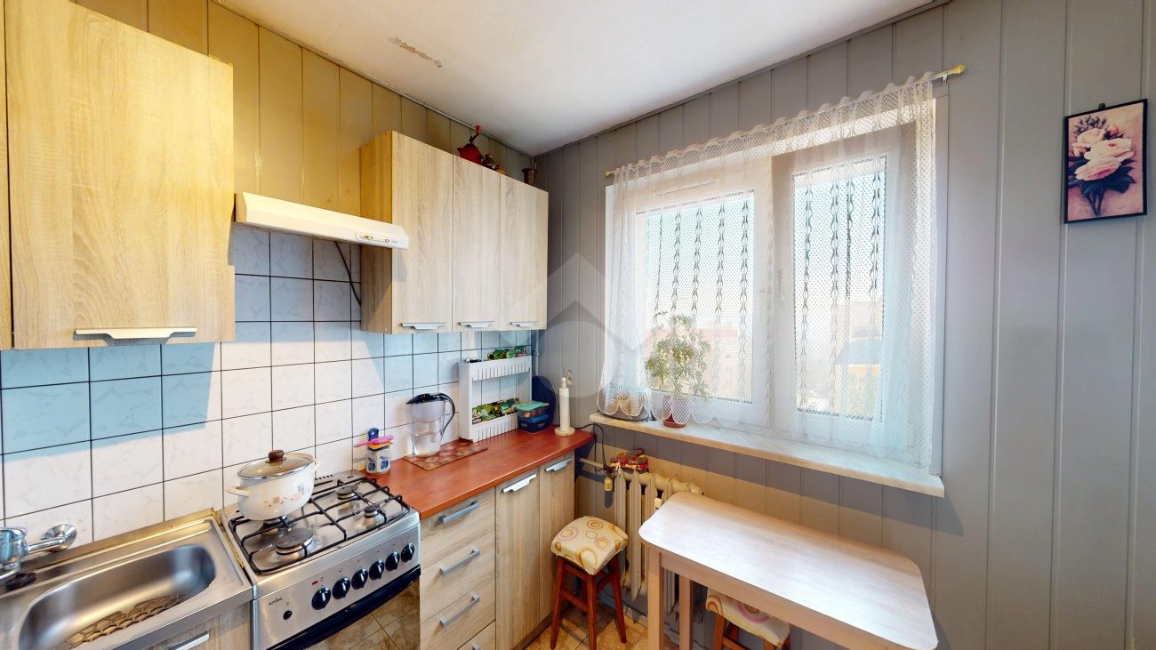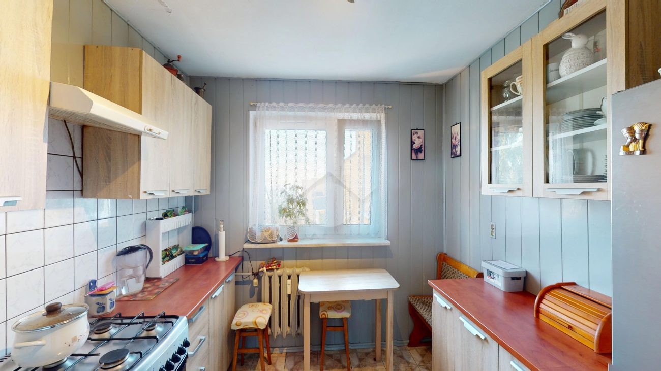 Kuchnia z oknem jest doskonale doświetlona i w pełni wyposażona – znajduje się w niej kuchenka gazowa, piekarnik, lodówka, zlew oraz liczne szafki oferujące dużo miejsca do przechowywania.