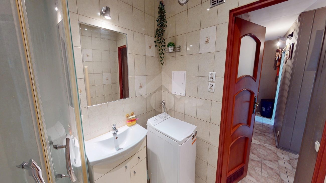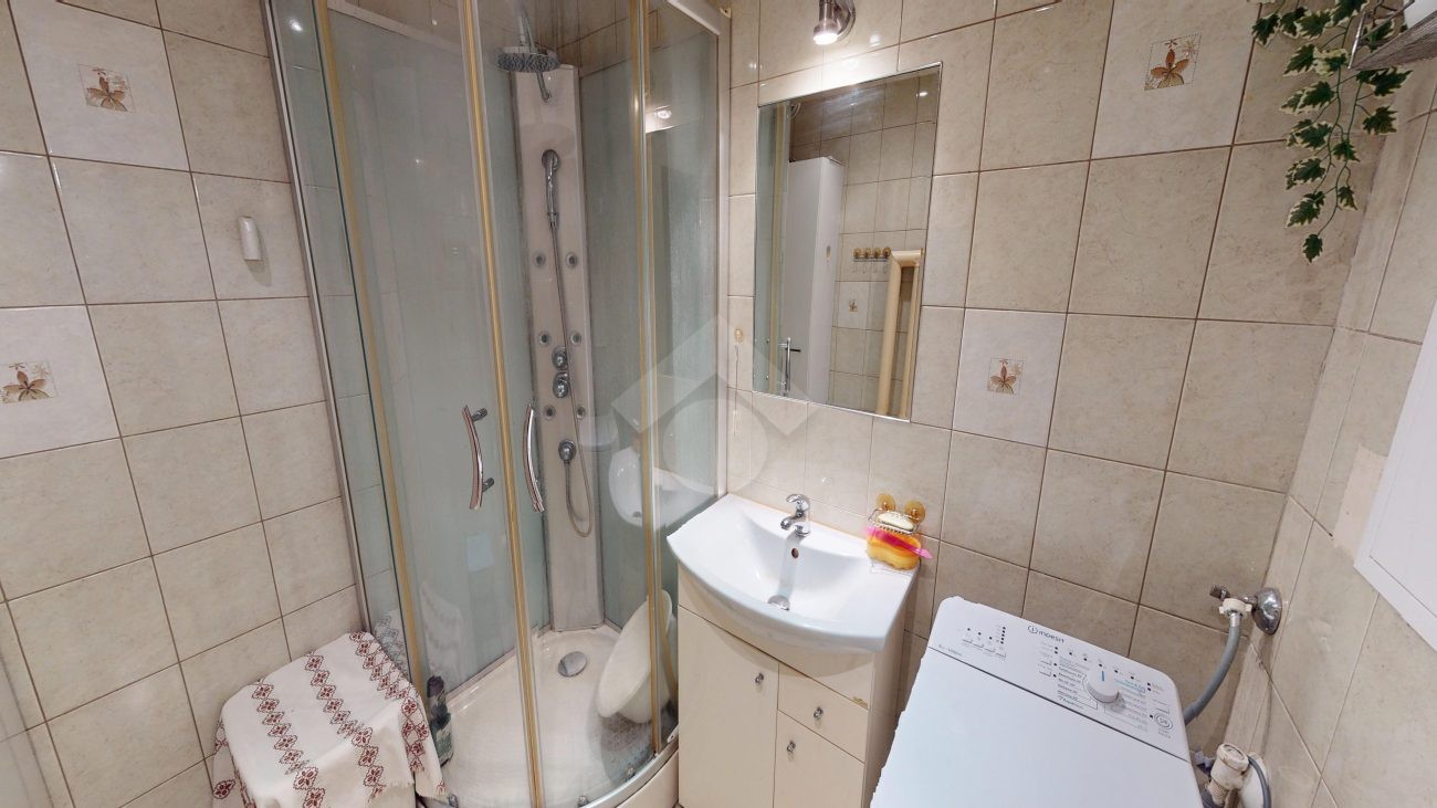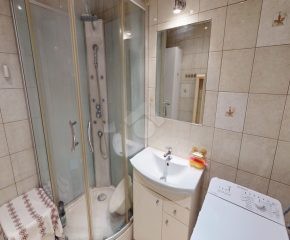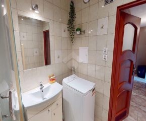 Łazienka wyposażona jest w prysznic, umywalkę oraz pralkę.