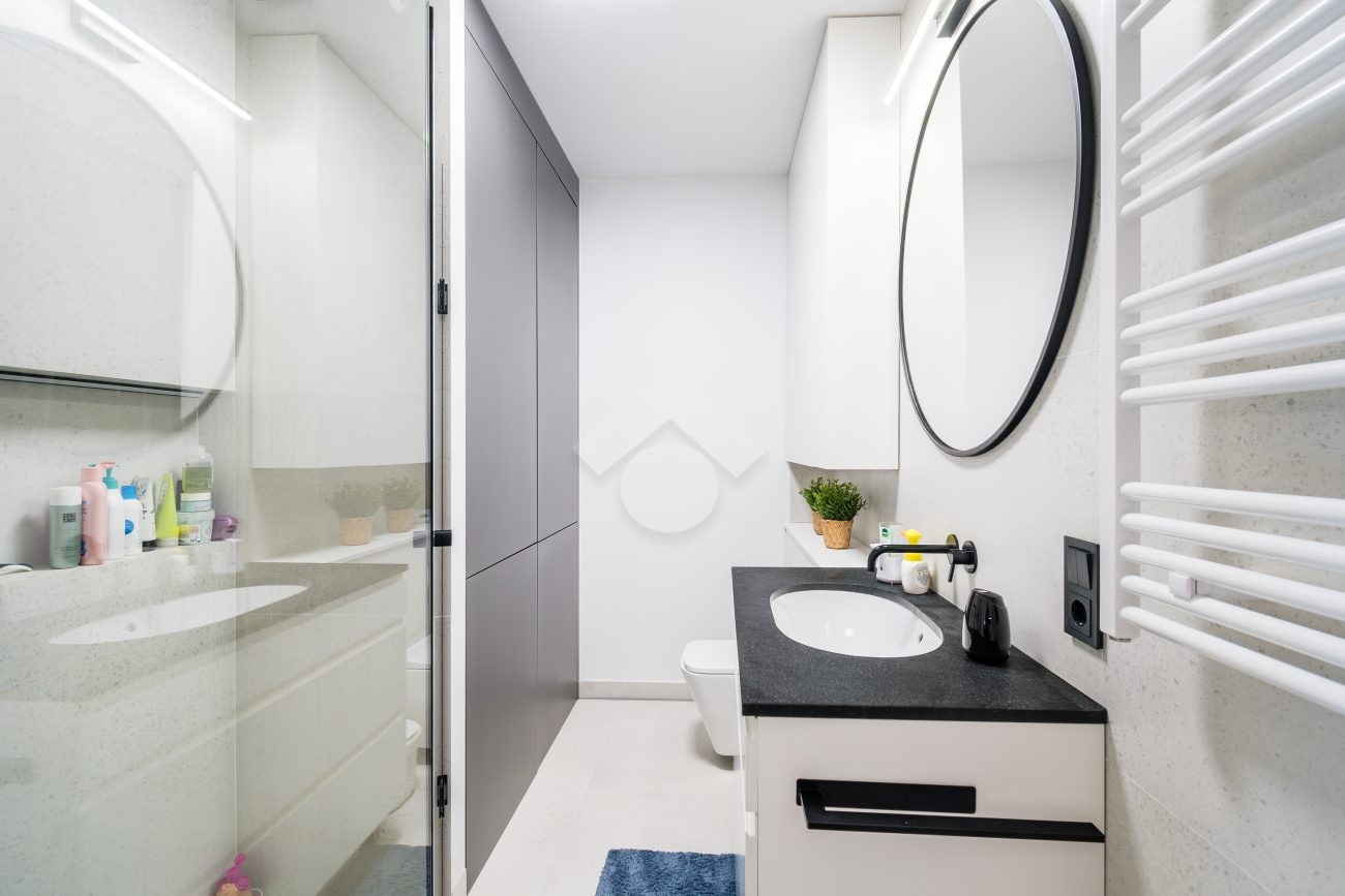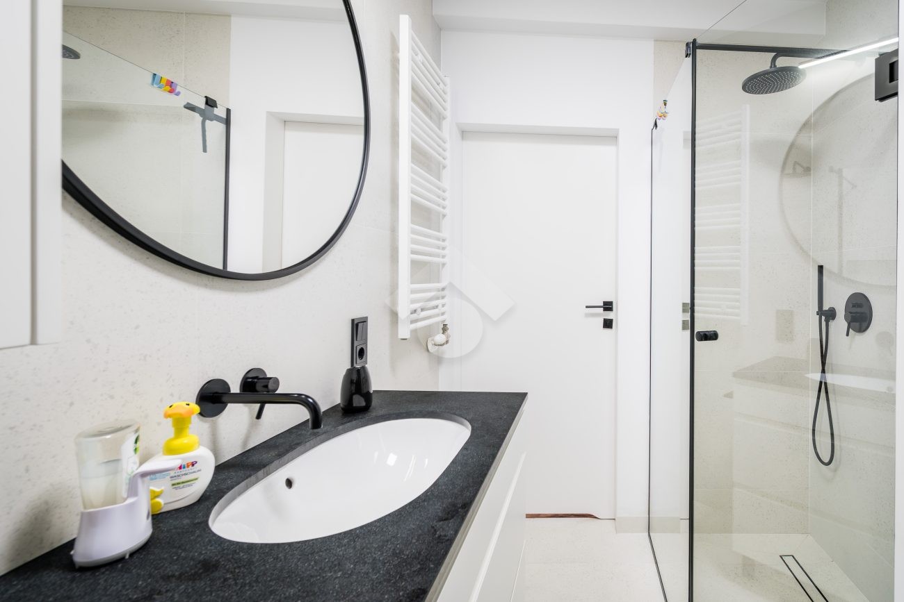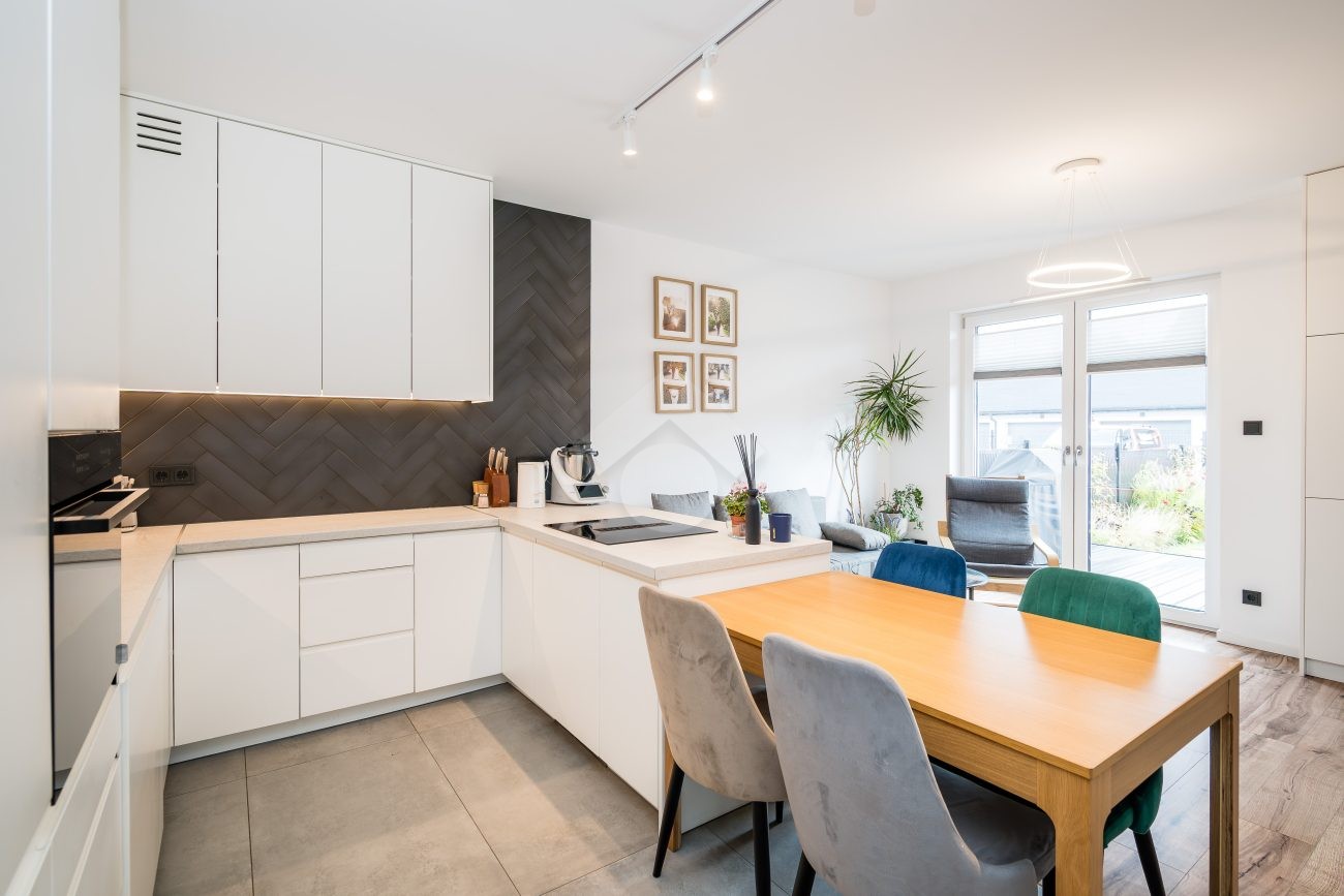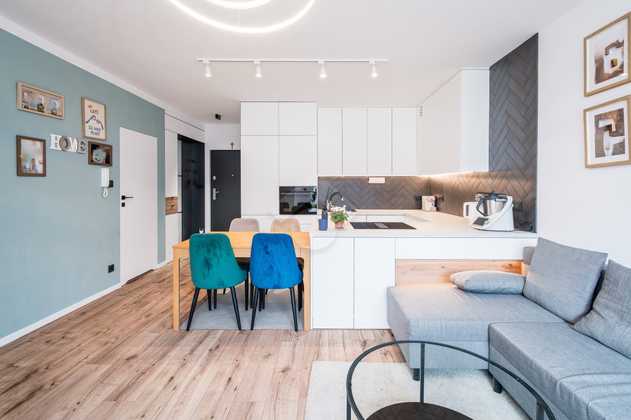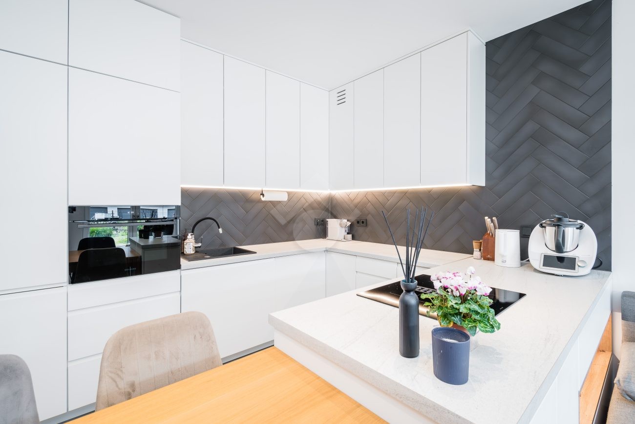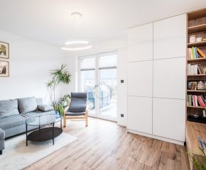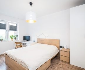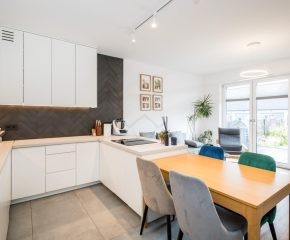 Stan nieruchomości: WYSOKI STANDARD. Ogrzewanie mieszkania realizowane jest za pomocą dwufunkcyjnego pieca gazowego. Kuchnia została wyposażona w meble w zabudowie oraz sprzęty AGD takie jak: lodówko-zamrażarka, płyta indukcyjna z wbudowanym okapem, piekarnik, oraz zmywarka. W salonie znajdują się: sofa, stół z krzesłami, stolik kawowy, szafa w zabudowie oraz szafka RTV. Łazienka wyposażona jest w prysznic, pralkę, umywalkę z szufladami oraz funkcjonalne szafki. Jedna z sypialni urządzona została w dwuosobowe łóżko, szafę i biurko, natomiast druga obecnie pełni funkcję pokoju dziecięcego. W garderobie zamontowano praktyczne regały w zabudowie.