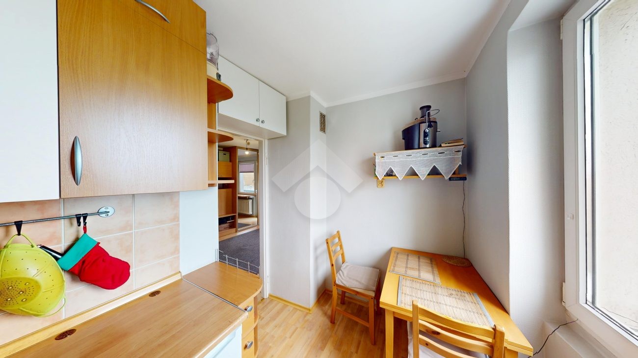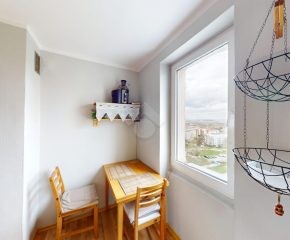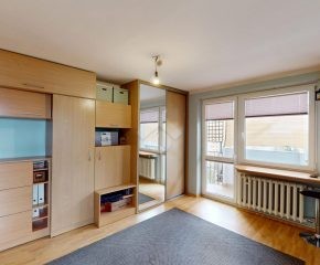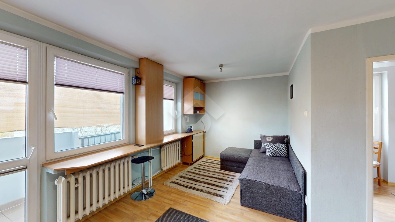 Duże okna w pokoju oraz kuchni wpuszczają dużo naturalnego światła, a przestronny balkon, rozciągający się na długość całego mieszkania, stanowi dodatkową przestrzeń do relaksu.