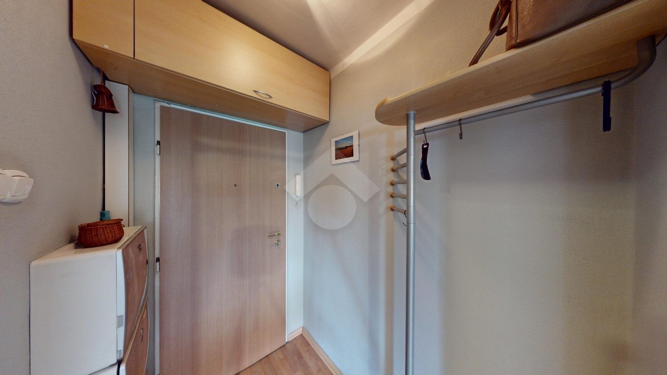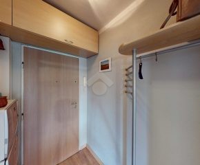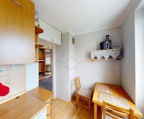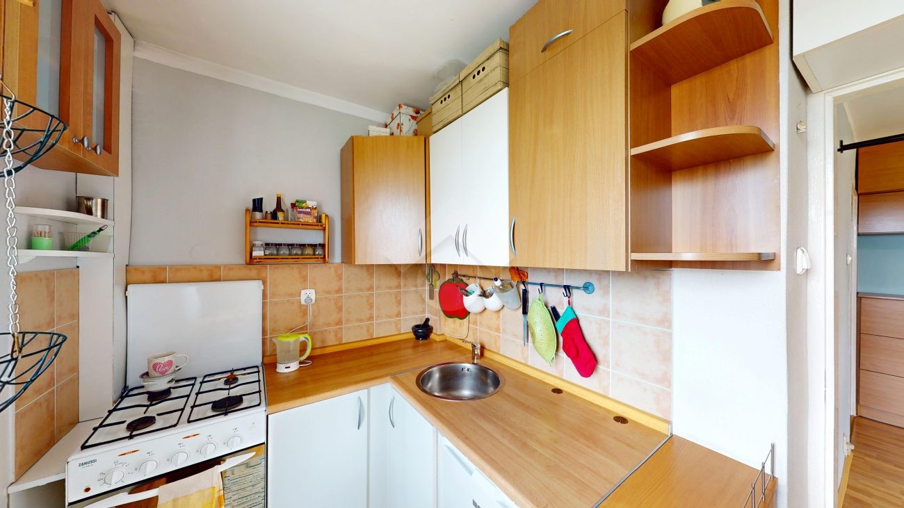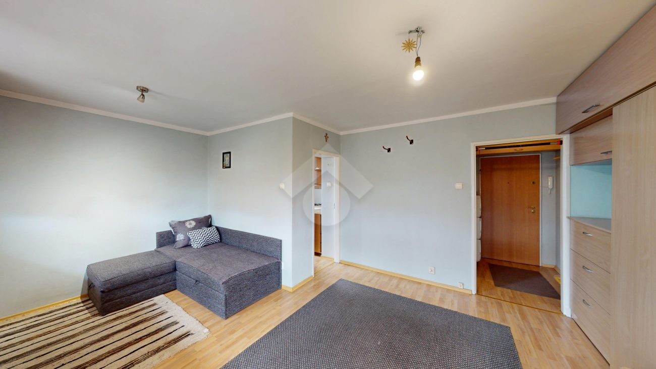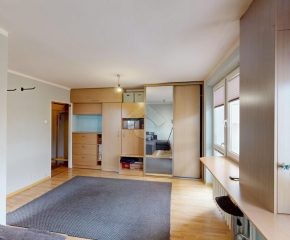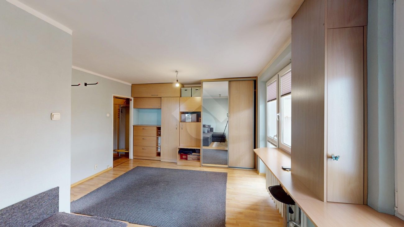 To mieszkanie o powierzchni 29,6 m² zostało zaprojektowane z myślą o maksymalnym wykorzystaniu przestrzeni. Pokój pełni funkcję zarówno sypialni, jak i salonu – znajduje się w nim rozkładana kanapa oraz zabudowane szafy.
