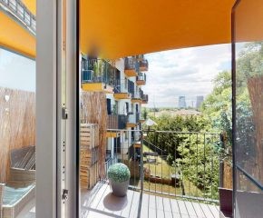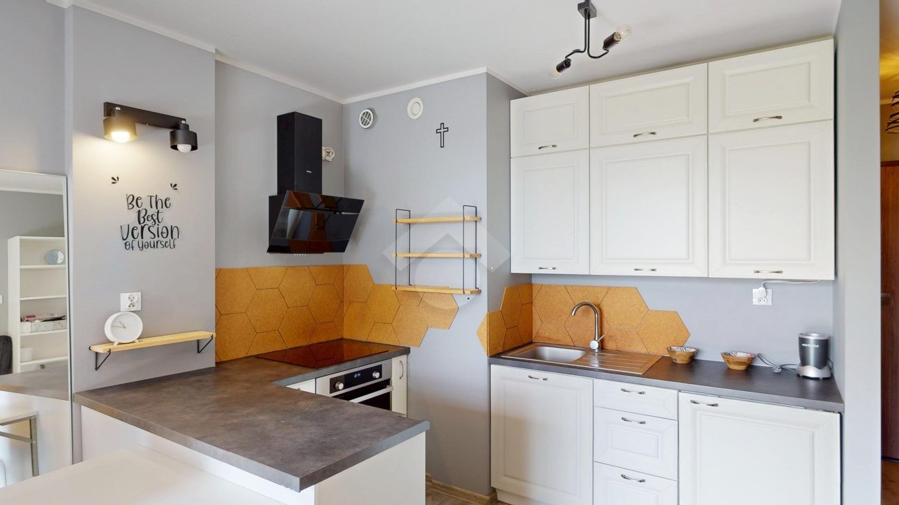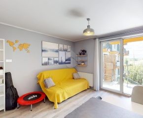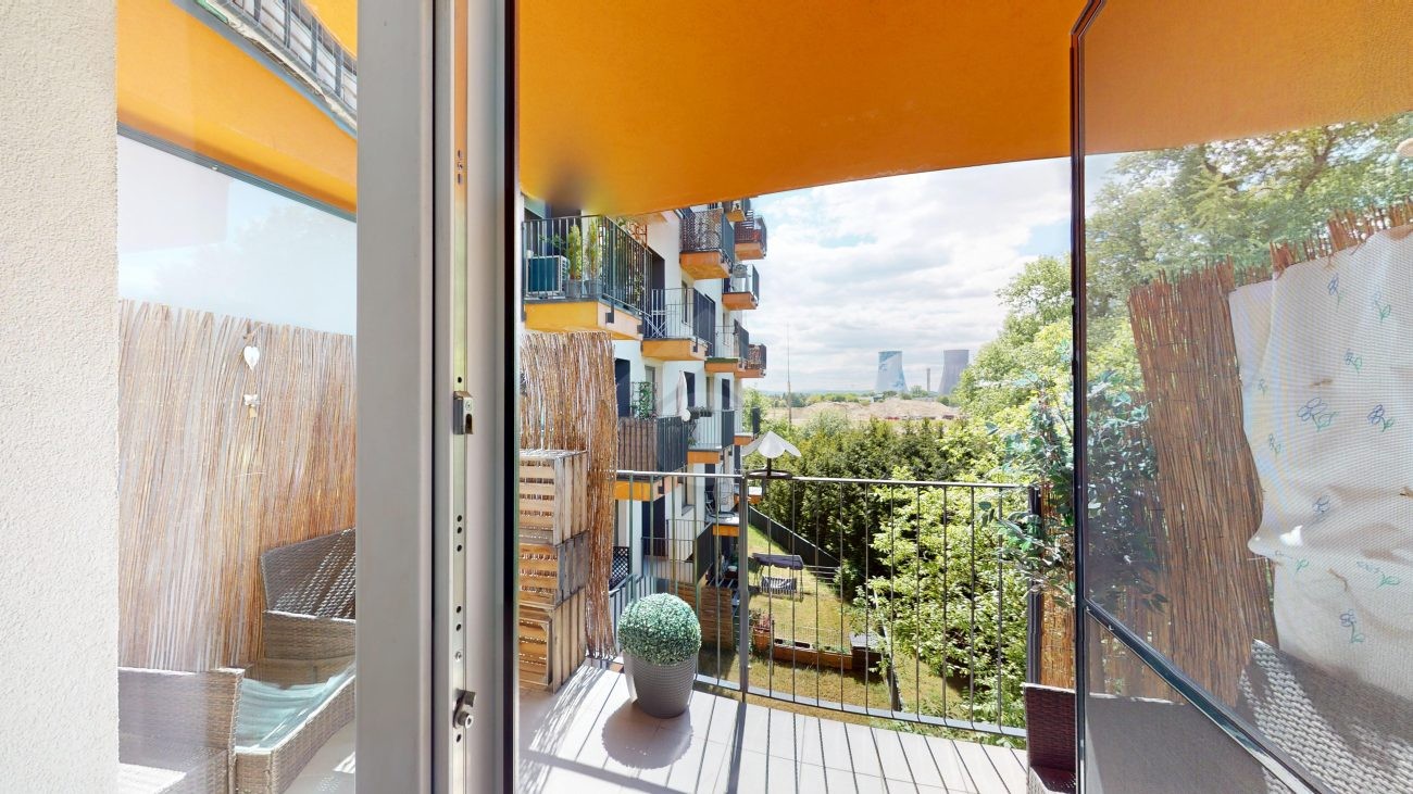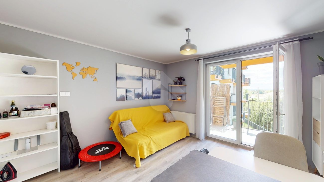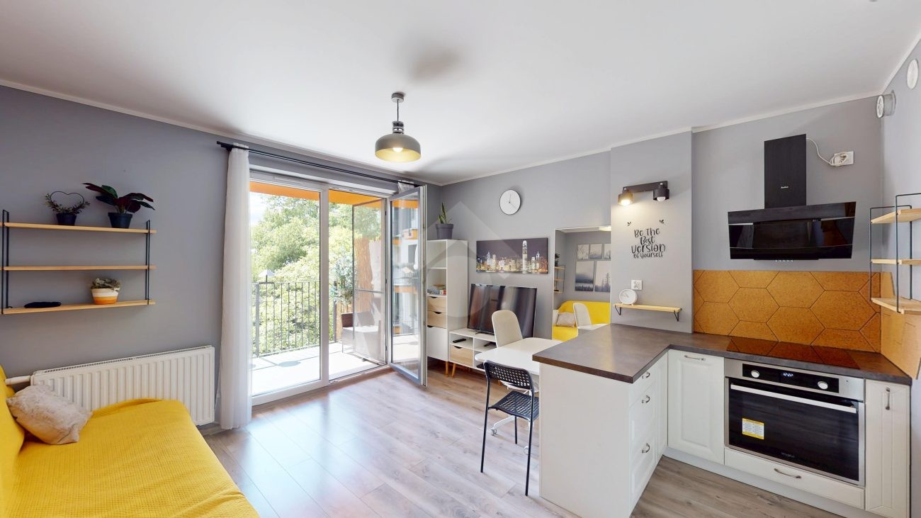 Duże okna w pokoju oraz kuchni wpuszczają dużo naturalnego światła, a przestronny balkon, rozciągający się na długość całego mieszkania, stanowi dodatkową przestrzeń do relaksu.