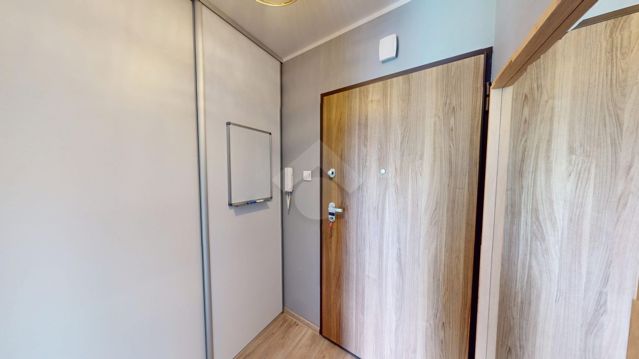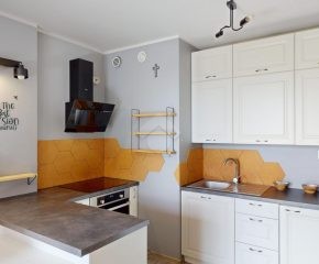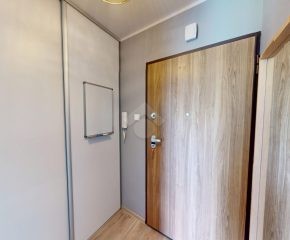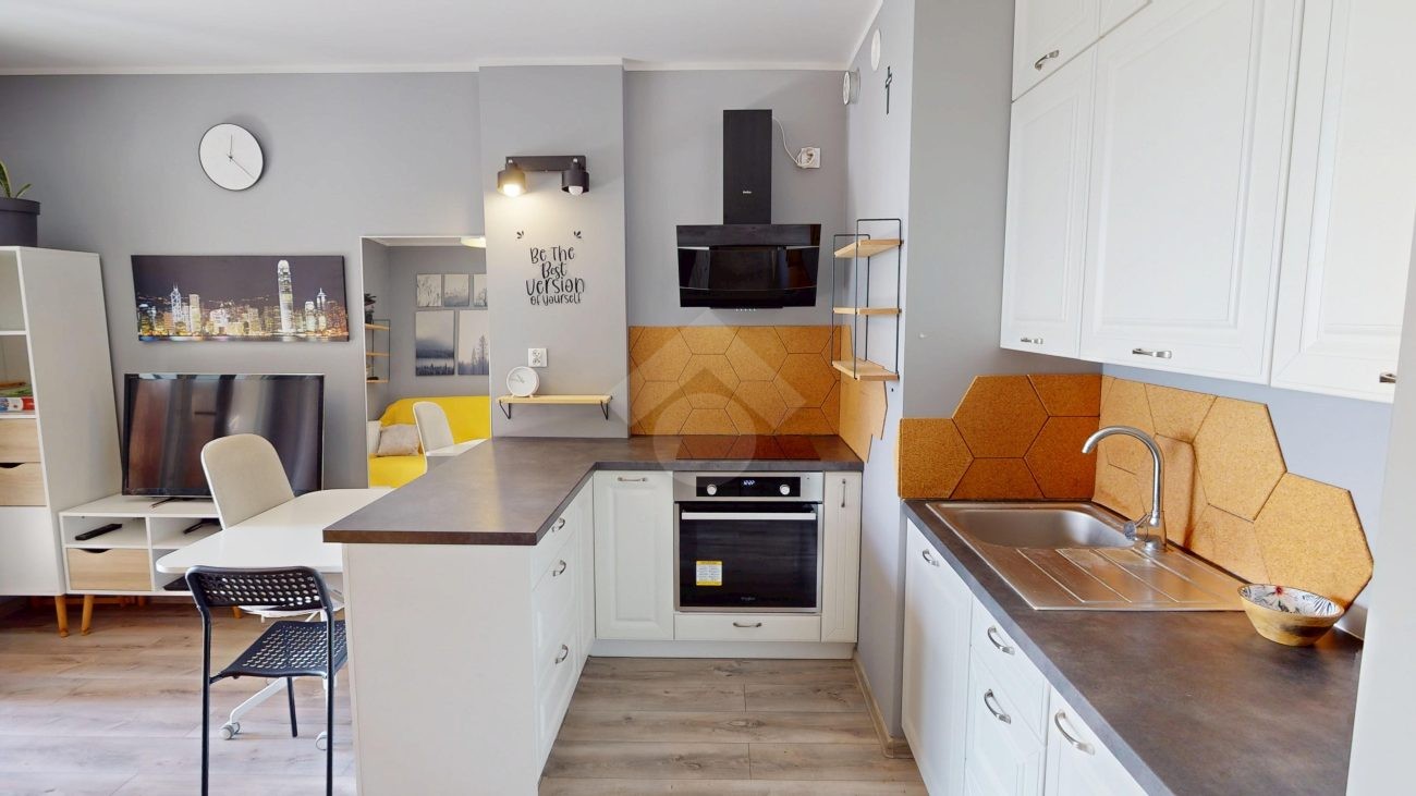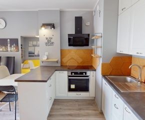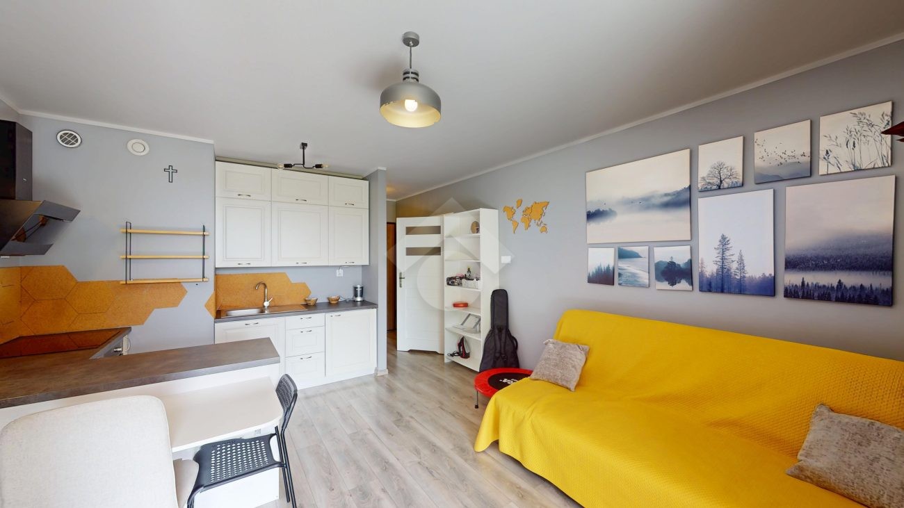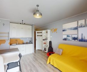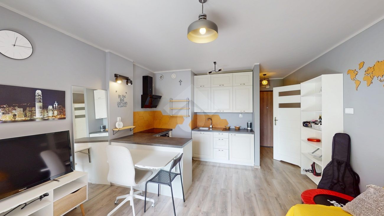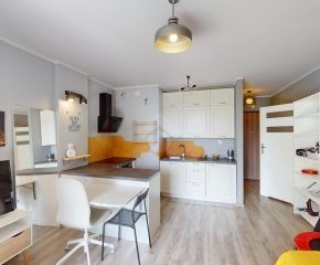 To mieszkanie o powierzchni 29,6 m² zostało zaprojektowane z myślą o maksymalnym wykorzystaniu przestrzeni. Pokój pełni funkcję zarówno sypialni, jak i salonu – znajduje się w nim rozkładana kanapa oraz zabudowane szafy.