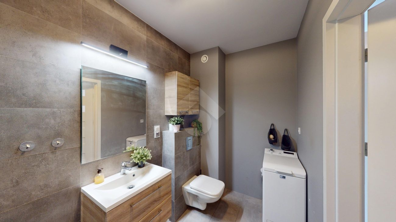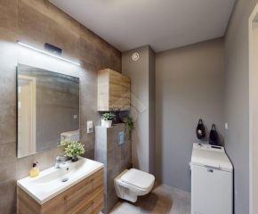 Łazienka wyposażona jest w wannę oraz pralkę.