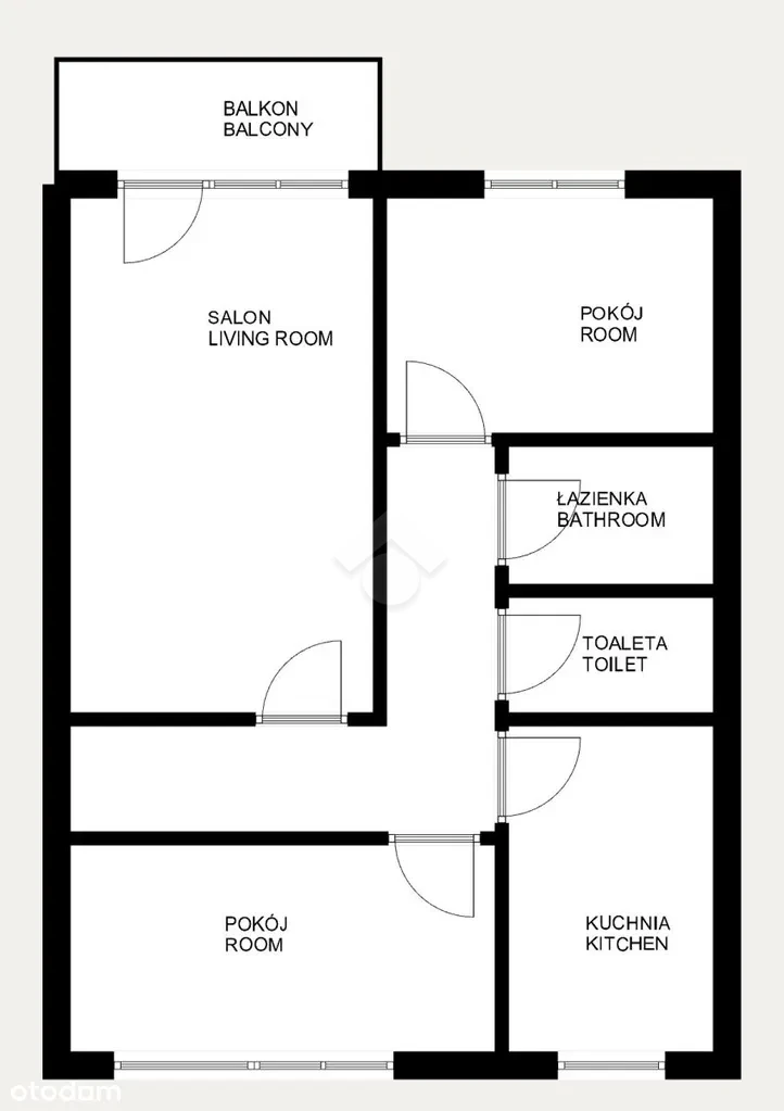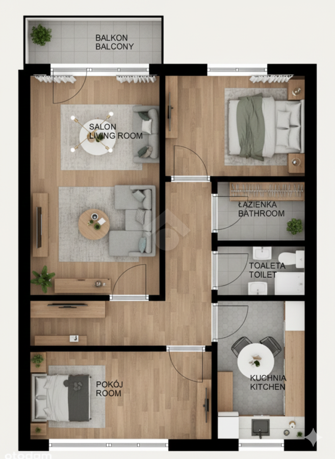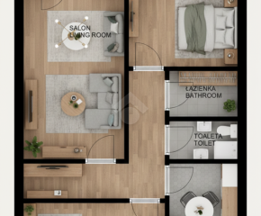 Lokal składa się z trzech oddzielnych, ustawnych pokoi, osobnej kuchni, łazienki, oddzielnego WC, korytarza oraz balkonu typu loggia, który stanowi dodatkową przestrzeń do wypoczynku.