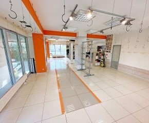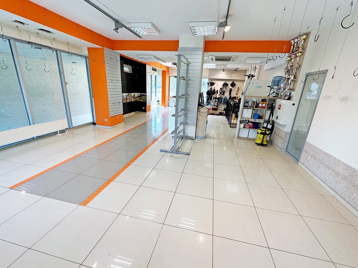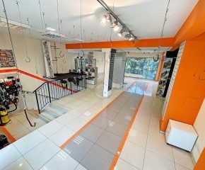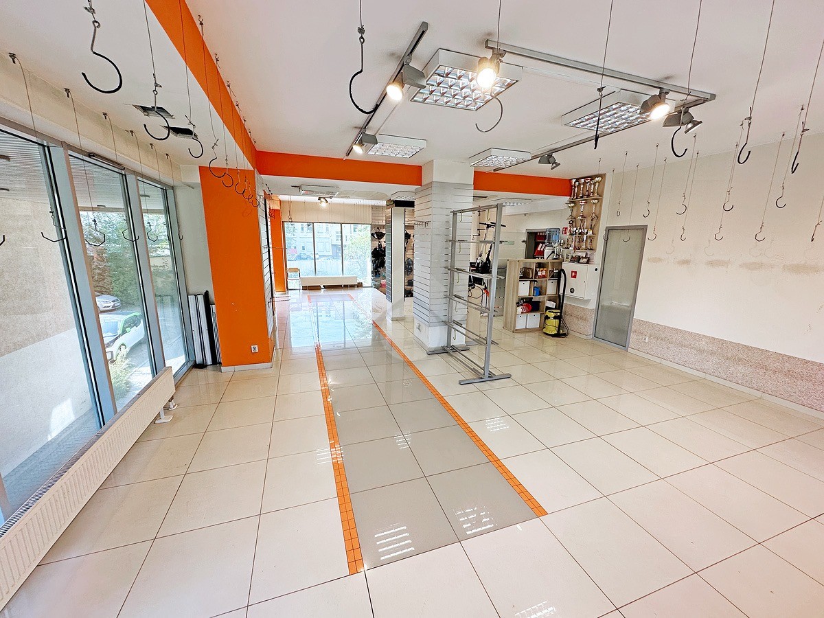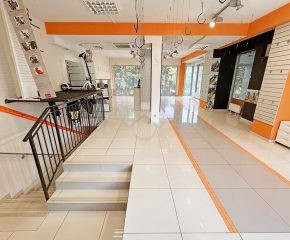 Oferowany lokal zajmuje parter oraz pierwsze piętro budynku. Położony jest wzdłuż ruchliwej ulicy, co zapewnia doskonałą widoczność oraz stały przepływ pieszych. Duże, przeszklone witryny od strony ulicy stanowią znakomitą przestrzeń ekspozycyjną, a wejście do lokalu usytuowane jest centralnie między nimi.