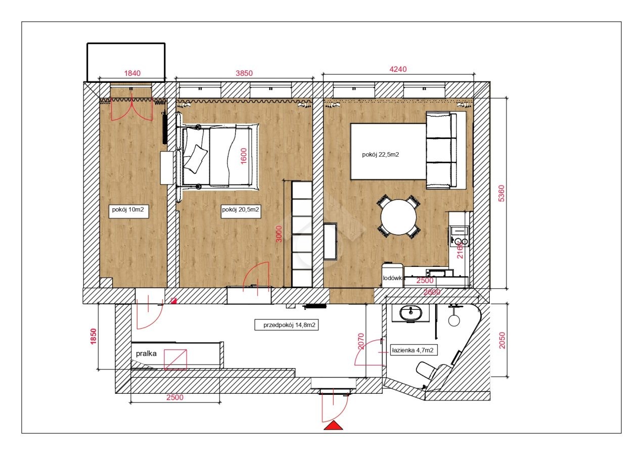 • pokój z aneksem kuchennym (22,50 m²)