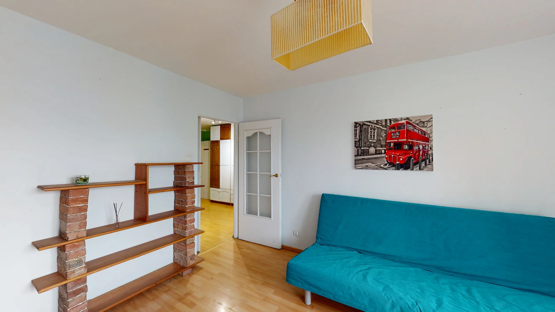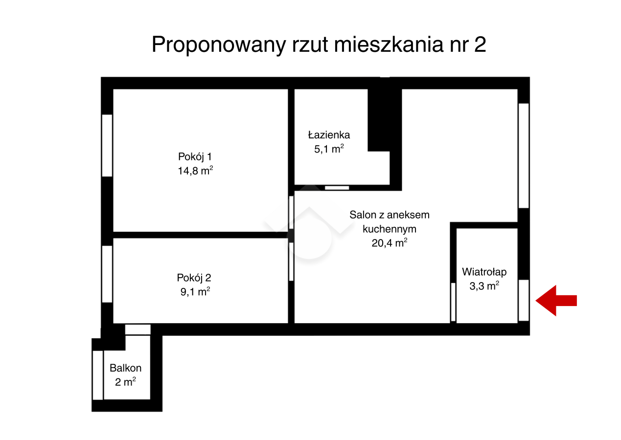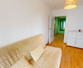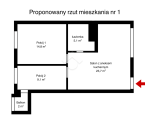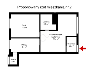 Istnieje możliwość stworzenia przestronnego salonu z aneksem kuchennym – poprzez usunięcie ścianki działowej między kuchnią a pokojem.
