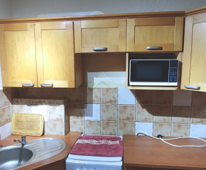 Kuchnia posiada niezbędne sprzęty AGD oraz liczne szafki.