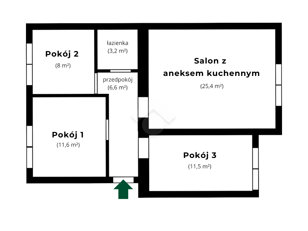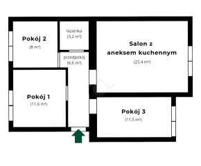 3 sypialnie ( 11,6 m² + 11,5 m² + 8 m² )